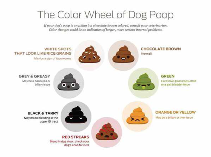 The below infographic shows how the shape, size, content, color, and consistency of a dog’s poop can give clues into any internal problems you and your vet may have missed or may need to investigate.